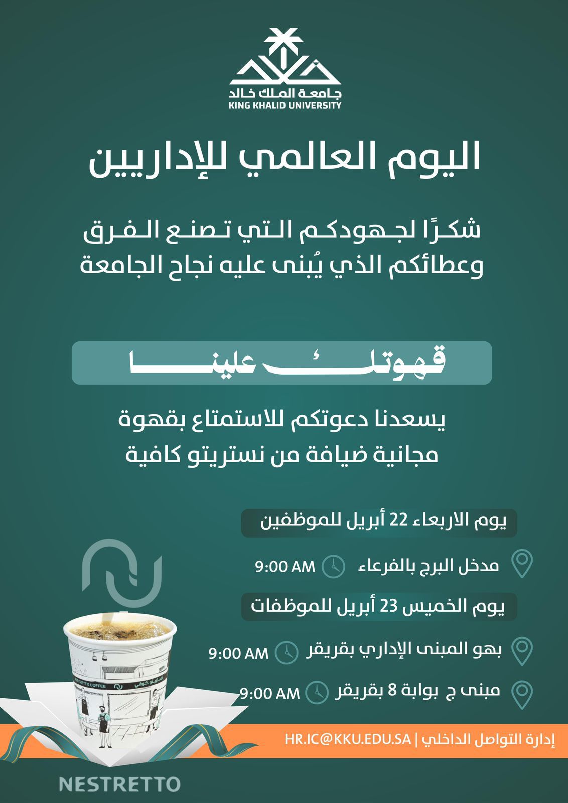 بمبادرة حملت شعار "قهوتك علينا"، احتفلت إدارة التواصل الداخلي بجامعة الملك خالد يوم الأربعاء الموافق ل٢٢ أبريل ٢٠٢٦ م باليوم العالمي للإداريين، حيث قدمت ضيافة خاصة لمنسوبي الجامعة في مختلف المقار الإدارية (بالفرعاء وقريقر) بالتعاون مع "نستريتو كافيه".