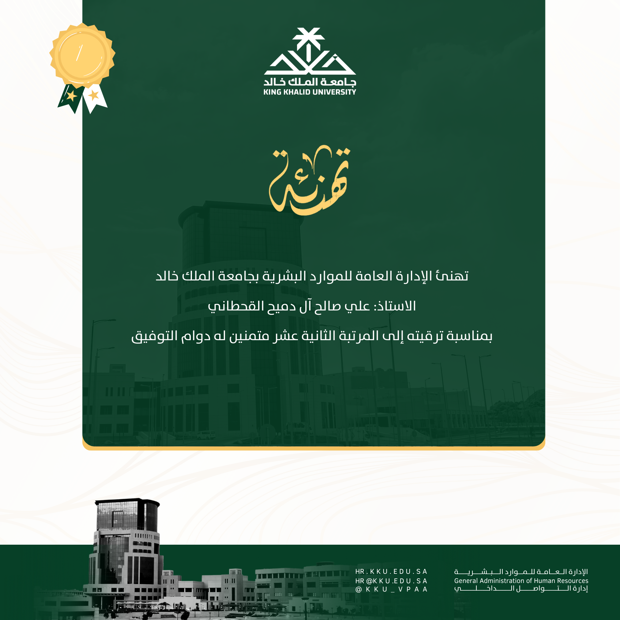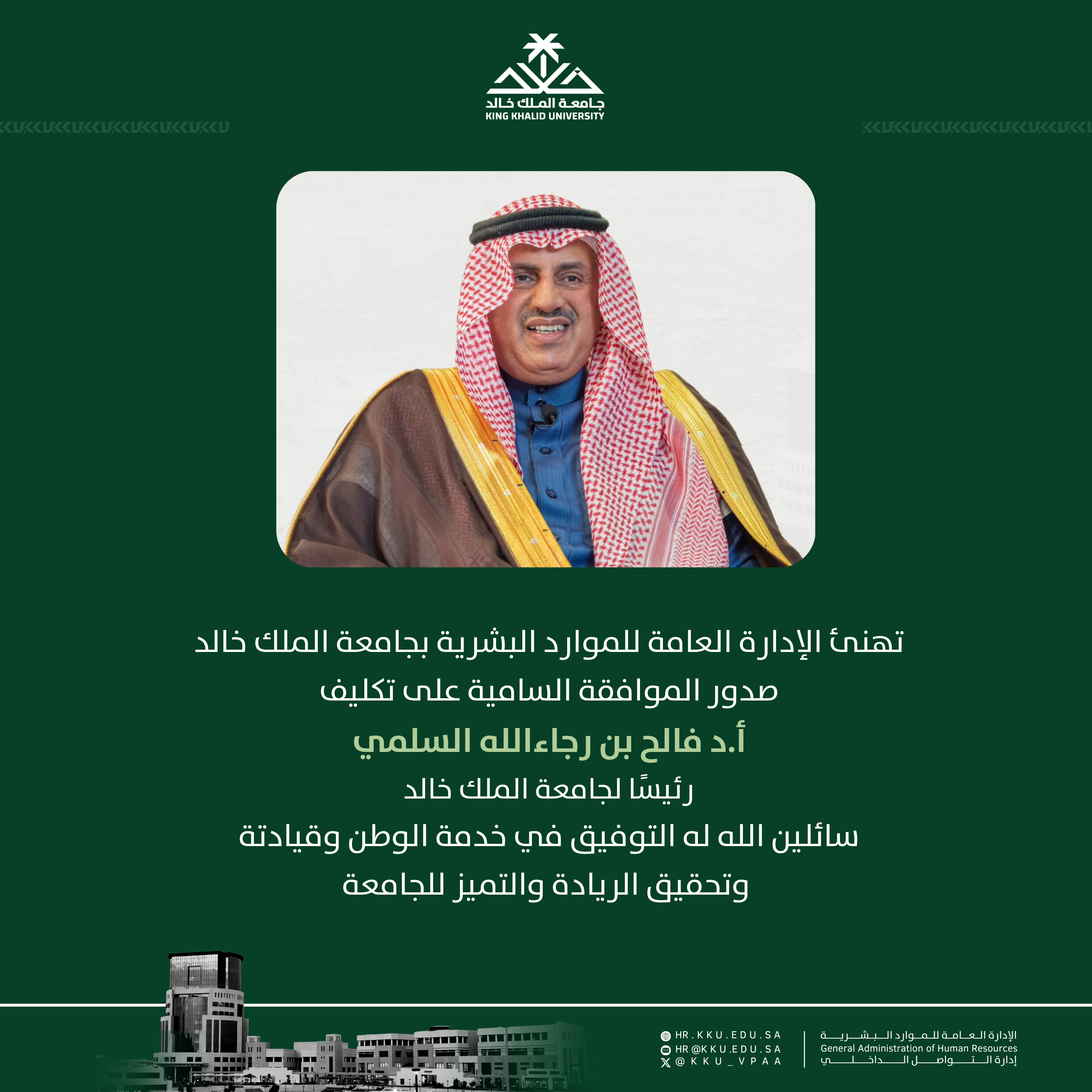 تهنئ الإدارة العامة للموارد البشرية بجامعة الملك خالد صدور الموافقة السامية على تكليف معالي أ.د فالح بن رجاء الله السلمي رئيسًا لجامعة الملك خالد سائلين الله له التوفيق في خدمة الوطن وقيادته وتحقيق الريادة والتميز للجامعة.