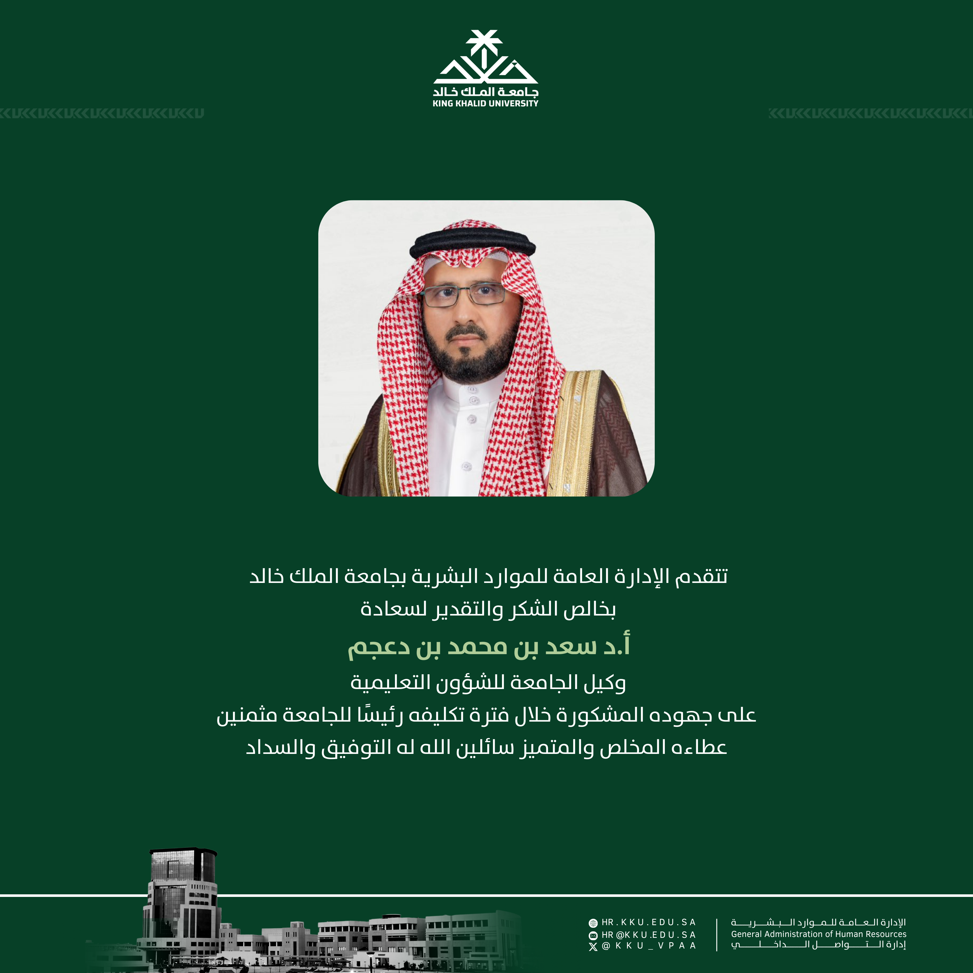 تتقدم الإدارة العامة للموارد البشرية بجامعة الملك خالد بخالص الشكر والتقدير لسعادة أ.د سعد بن محمد بن دعجم وكيل الجامعة للشؤون التعليمية على جهوده المشكورة خلال فترة تكليفه رئيسًا للجامعة مثمنين عطاءه المخلص والمتميز سائلين الله له التوفيق والسداد.