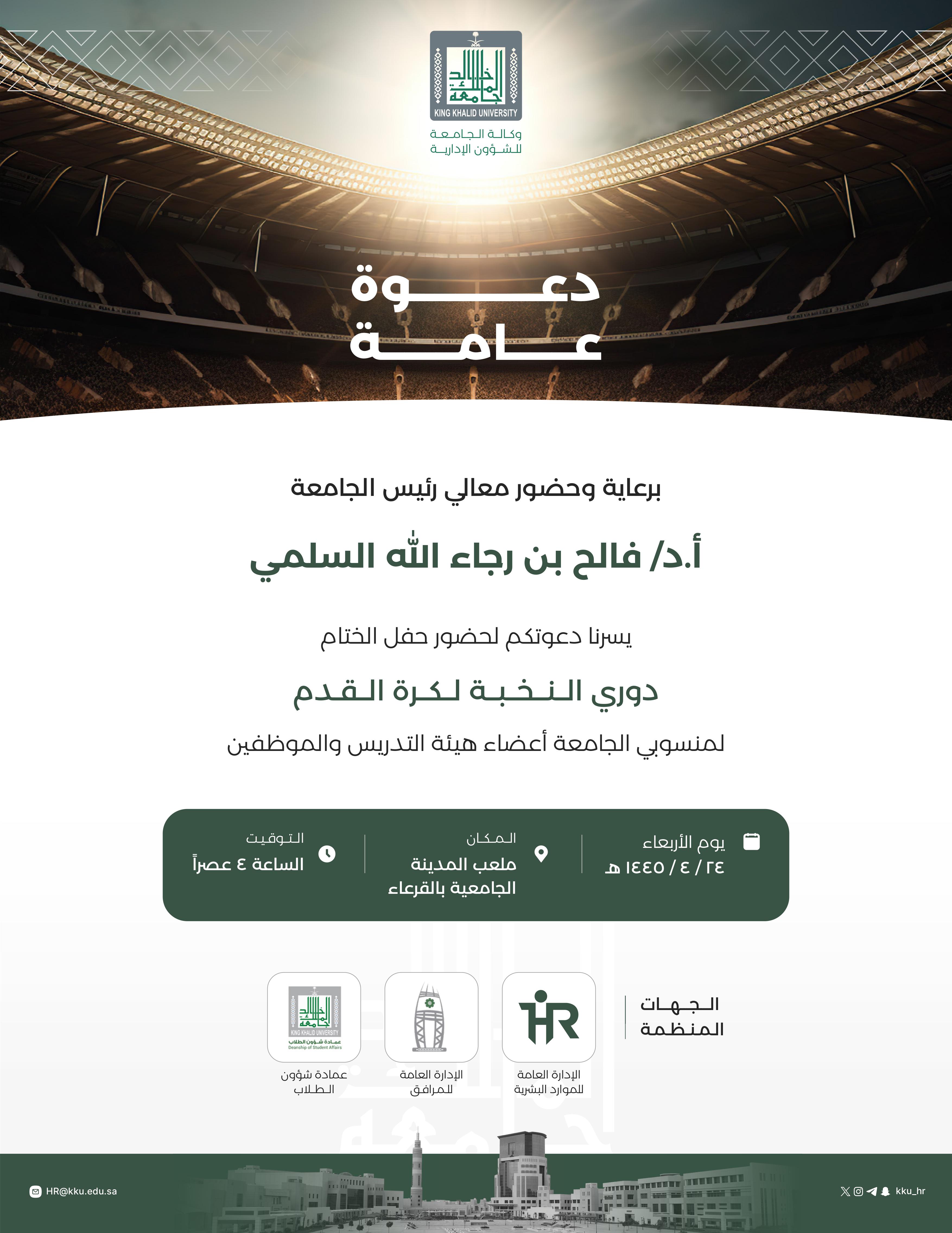 برعاية وحضور معالي رئيس الجامعة أ.د. فالح بن رجاء الله السلمي يسرنا دعوتكم لحضور حفل ختام دوري النخبة لكرة القدم لمنسوبي الجامعة من أعضاء هيئة التدريس والموظفين.