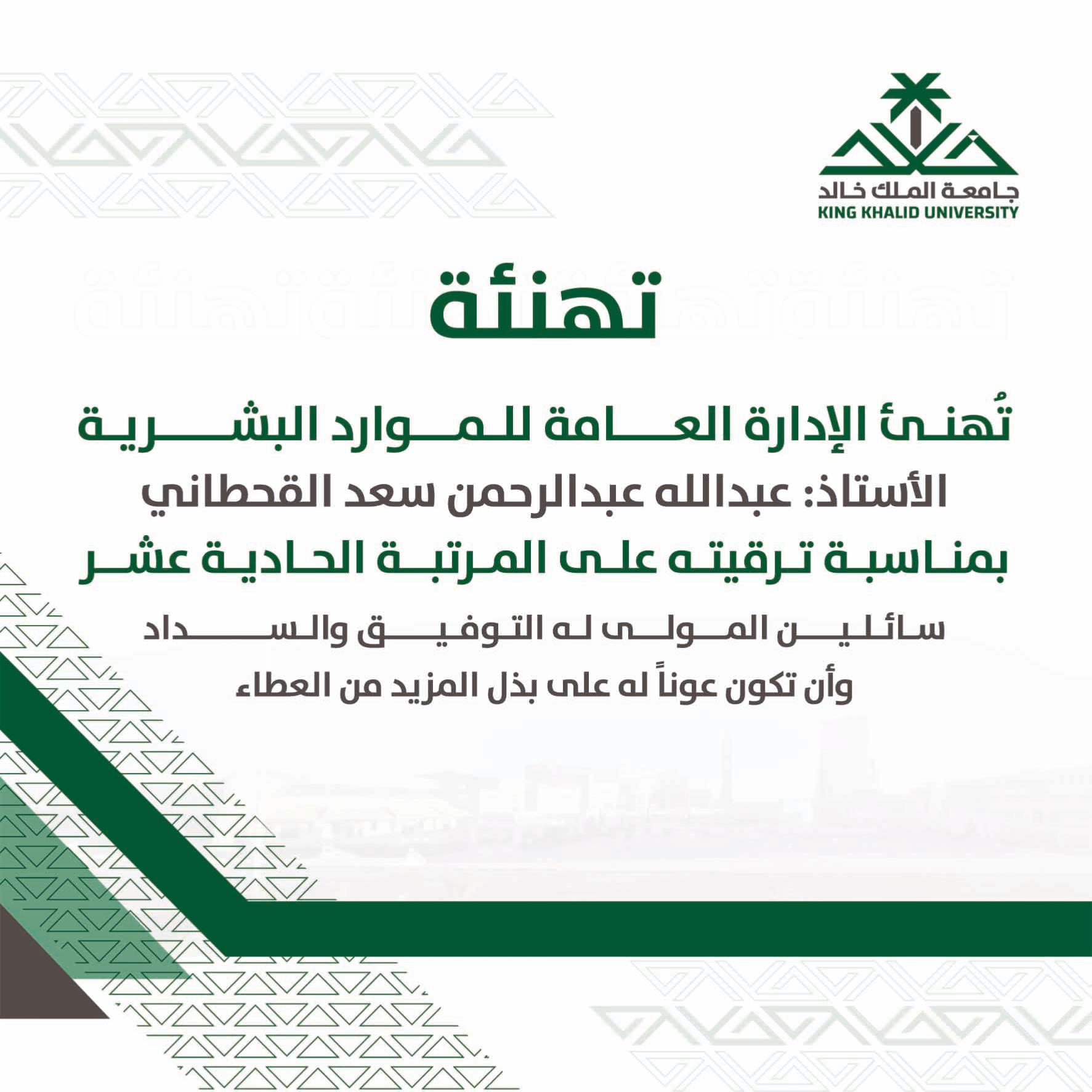 تهنئ الإدارة العامة للموارد البشرية الأستاذ / عبدالله بن عبدالرحمن سعد القحطاني