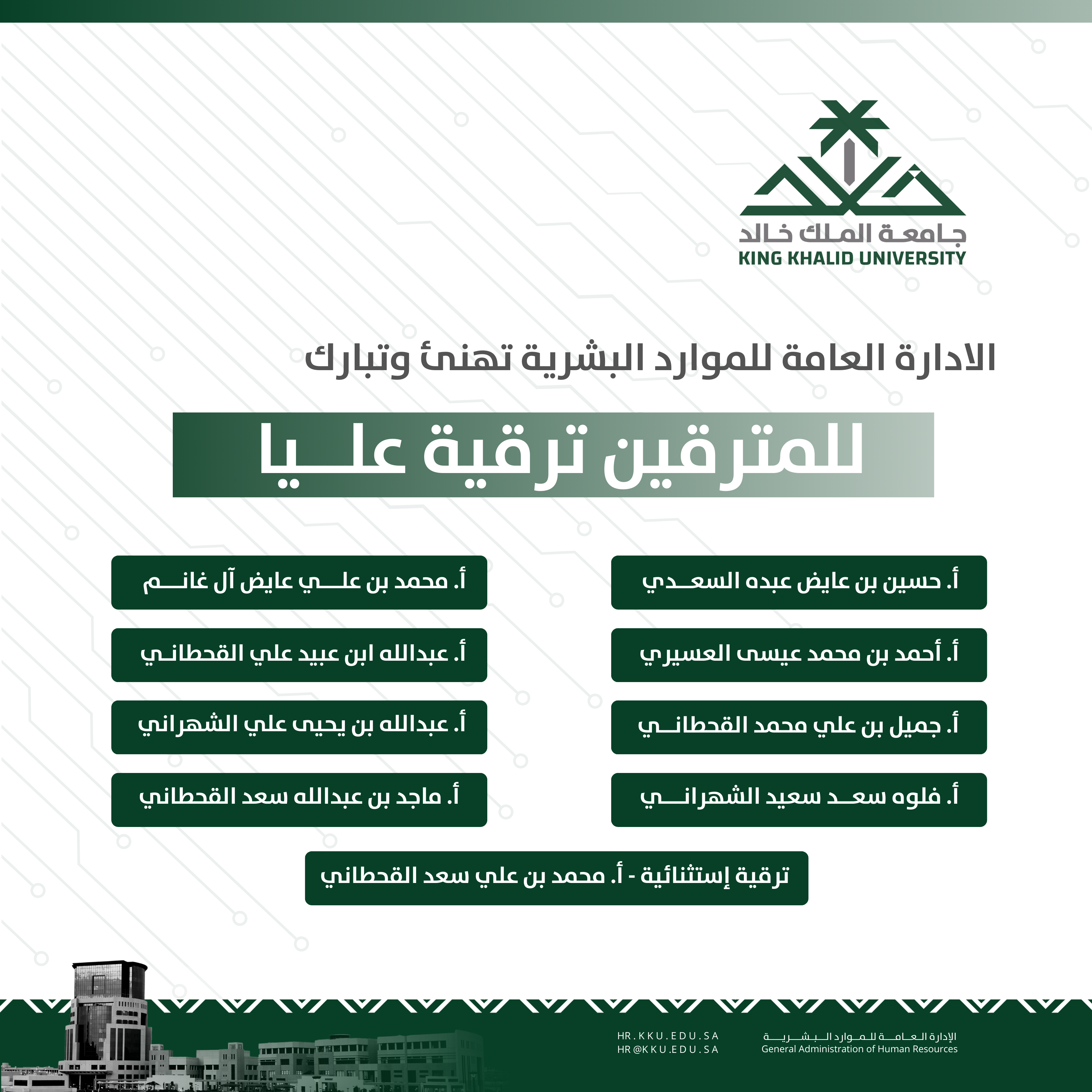 في إطار تقديرها للجهود المتميزة والعطاء الدؤوب لمنسوبيها، أعلنت الادارة العامة للموارد البشرية بجامعة الملك خالد باعتماد الترقيات العليا لعدد من موظفيها بناءً على توصية لجنة الترقيات وموافقة معالي رئيس الجامعة.