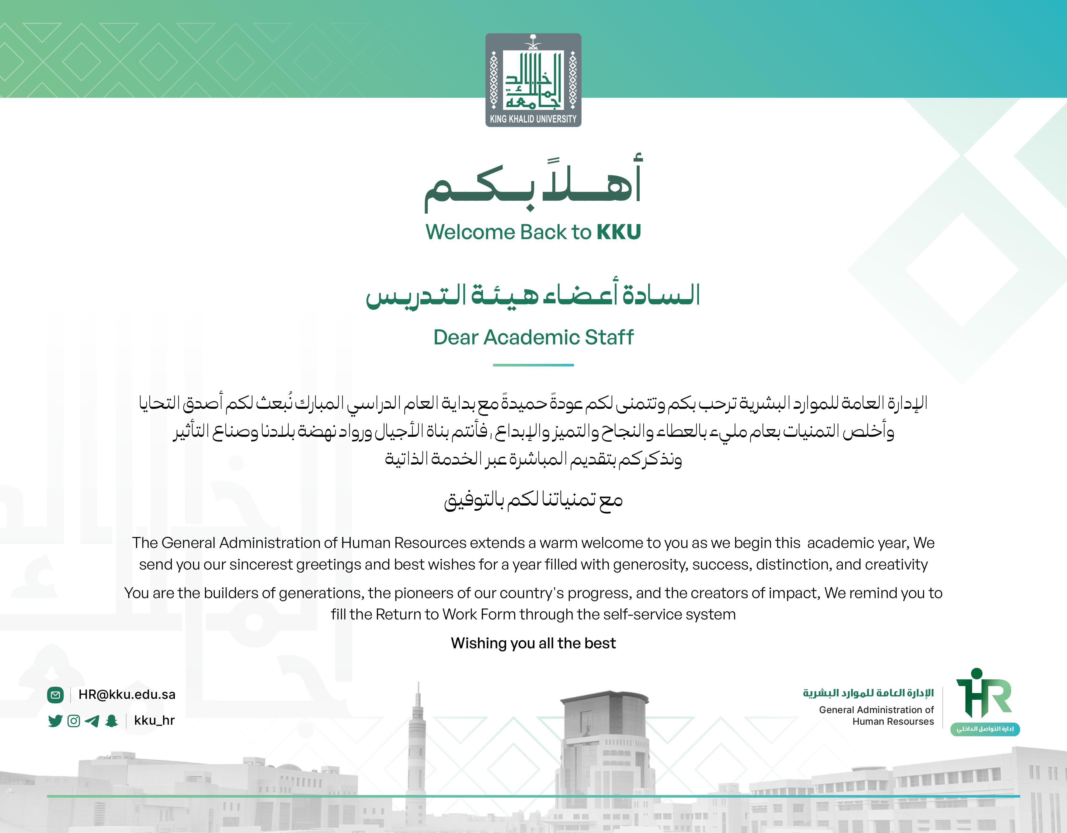 الإدارة العامة للموارد البشرية ترحب بكم وتتمنى لكم عودةً حميدةً مع بداية العام الدراسي المبارك نبعثُ لكم أصدق التحايا وأخلص التمنيات بعام مليء بالعطاء والنجاح والتميز والإبداع، فأنتم بناة الأجيال ورواد نهضة بلادنا وصناع التأثير،